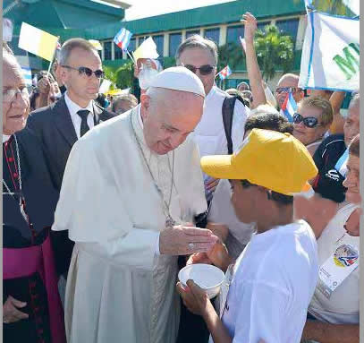 Un coro niños de la Diócesis le cantó al Papa mientras uno de ellos le ofreció agua de la Bahía de Nipe para que se santiguase y le hiciera a él la señal de la Cruz.