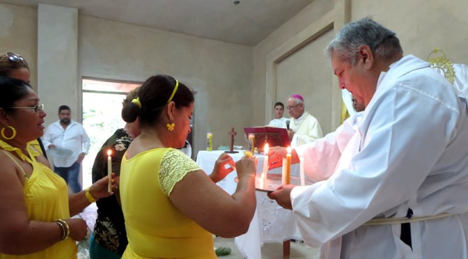 Acompañó al obispo el P. Francisco (Frank) Lugones, hoy párroco en San Andrés, quien en 2008 lo era en esta comunidad de San Miguel Arcángel, que vio derrumbarse su templo de madera por los embates del ciclón.