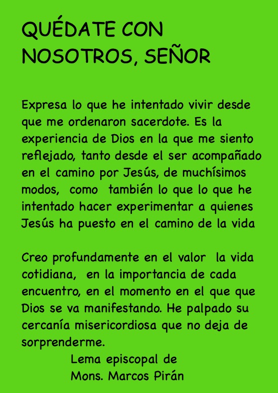 Desde su nombramiento, al P. Marcos se le puede llamar ‘monseñor’ y puede usar anillo y pectoral. El mismo ha explicado el lema episcopal elegido, del Evangelio de Lucas 24, 28: “Quédate con nosotros, Señor». Dice que “expresa lo que he intentado vivir desde que me ordenaron sacerdote.
