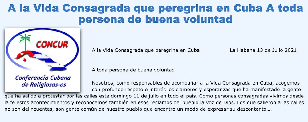 El sitio Web del CELAM también se ha hecho eco del reciente mensaje de La Conferencia Cubana de Religiosas -os (Concur), apoyando los reclamos del Pueblo de Dios en Cuba y afirmando que quienes “salieron a las calles no son delincuentes, son gente común de nuestro pueblo que encontró un modo de expresar su descontento”.