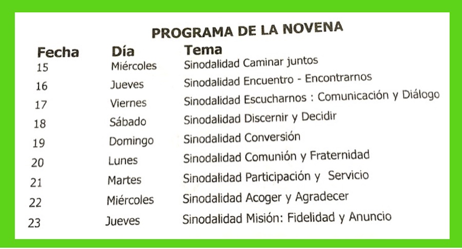 Cada día la novena tiene un tema centrado en lo que hoy vive la Iglesia que es un proceso de ‘sinodalidad’, lo que significa un caminar juntos hacia el Sínodo que tendrá lugar en Roma en el año 2023.