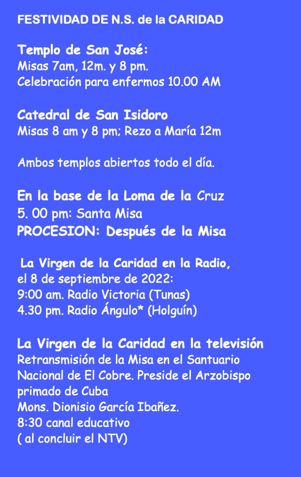 Y en el día de la Fiesta de la Virgen de la Caridad del Cobre, “miramos hacia arriba para recibir la fuerza de Dios y, a su vez, miramos hacia adelante, hacia el futuro, y lo hacemos renovando nuestro compromiso cristiano en este presente difícil e incierto, y renovamos nuestra disposición a continuar “caminando juntos” porque “aunque parezcan tus pasos inútil caminar, tú vas haciendo caminos, otros los seguirán”.