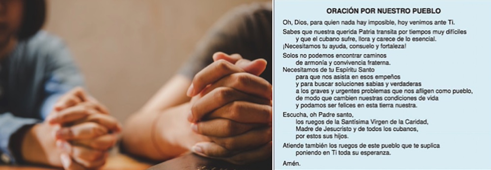 El pueblo se une en esta oración que ya conocen de memoria. Los obispos la lanzaron en el marco de este año, que el Papa había dedicado a la oración. Los obispos divulgaron la oración que se rezaría al final de las celebraciones de cada domingo y que muchos sacerdotes la proclaman cada día al finalizar la Eucaristía. El texto de esta oración reconoce que “ nuestra querida Patria transita por tiempos muy difíciles y que el cubano sufre, llora y carece de lo esencial “.