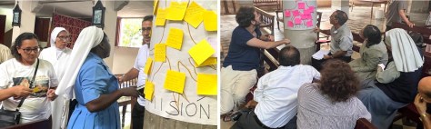 El obispo auxiliar Mons. Marcos Pirán, sacerdotes, religiosas y laicos trabajaron por grupos y utilizaron dinámicas para constatar el estado de las distintas áreas de pastoral y proponer acciones concretas.