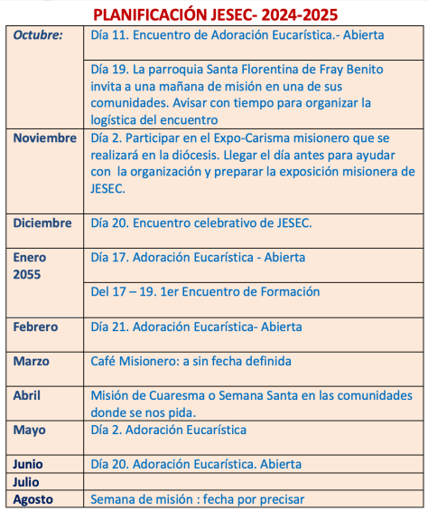 Se mantendrán dos encuentros formativos de fin de semana y una semana de misión. Todo ello se planificó con fechas concretas para todo el año “acordando que cada tres meses las fechas podrían ser revisables, tendiendo a las situaciones del grupo y necesidades de la diócesis”.