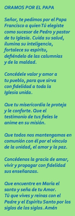En su reflexión radial el obispo de la Diócesis de Holguín ha compartido que los obispos tuvieron un especial recuerdo para el Papa que lleva días hospitalizado con problemas respiratorios y en situación crítica. Monseñor ha invitado a los católicos ha unirse en la oración por el Papa que aparece aquí mismo sobre color verde.