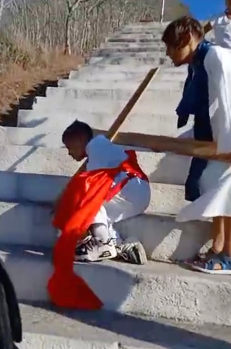 Cargando la cruz iban subiendo escalones. “Pedimos al Señor su gracia para cargar nuestra cruz”, leyeron mientras contemplaban la primera caida de Jesús bajo el peso de la cruz .