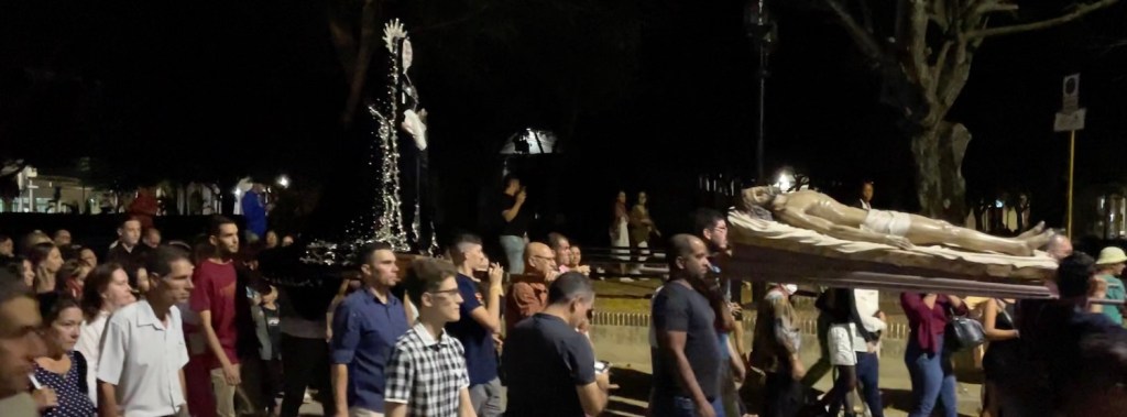 Al llegar a la plaza delante de la parroquia de San José se unió el grupo que rezaba el Via crucis. También varios hombres cargando una imagen de Jesús yaciente de la parroquia, se unieron a la procesión.