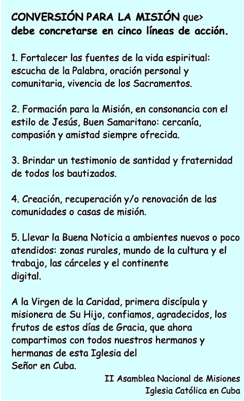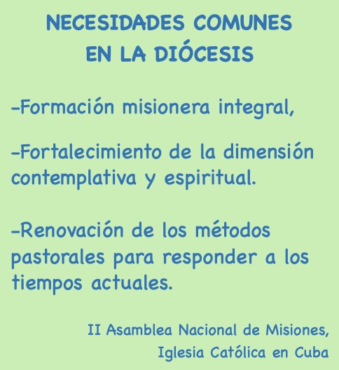 Además, los representantes de las once diócesis de Cuba identificaron necesidades comunes como: Formación misionera integral, fortalecimiento de la dimensión contemplativa y espiritual y renovación de los métodos pastorales para responder a los tiempo actuales. Los trabajos preliminares señalaron varias propuestas pastorales que serían después resumidas en un mensaje final bajo una llamada. la Conversión con varias líneas de Acción. (Ver resumen final en azul)