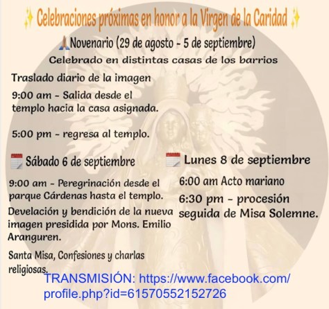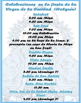 También la Oficina de comunicaciones ha creado un programa especial dedicado a la Virgen de la Caridad que se transmitirá por las emisoras provinciales: el lunes 8 de septiembre a las 9:00 am por Radio Victoria en Las Runas y a las 10:00 am por Radio Angulo en Holguín.