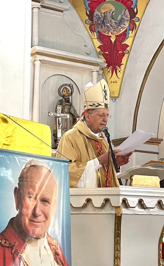 Oración del cardenal Stella a san Juan Pablo II ante la imagen en el atrio de la catedral de Holguín que conmemora su visita a Cuba en 1998
